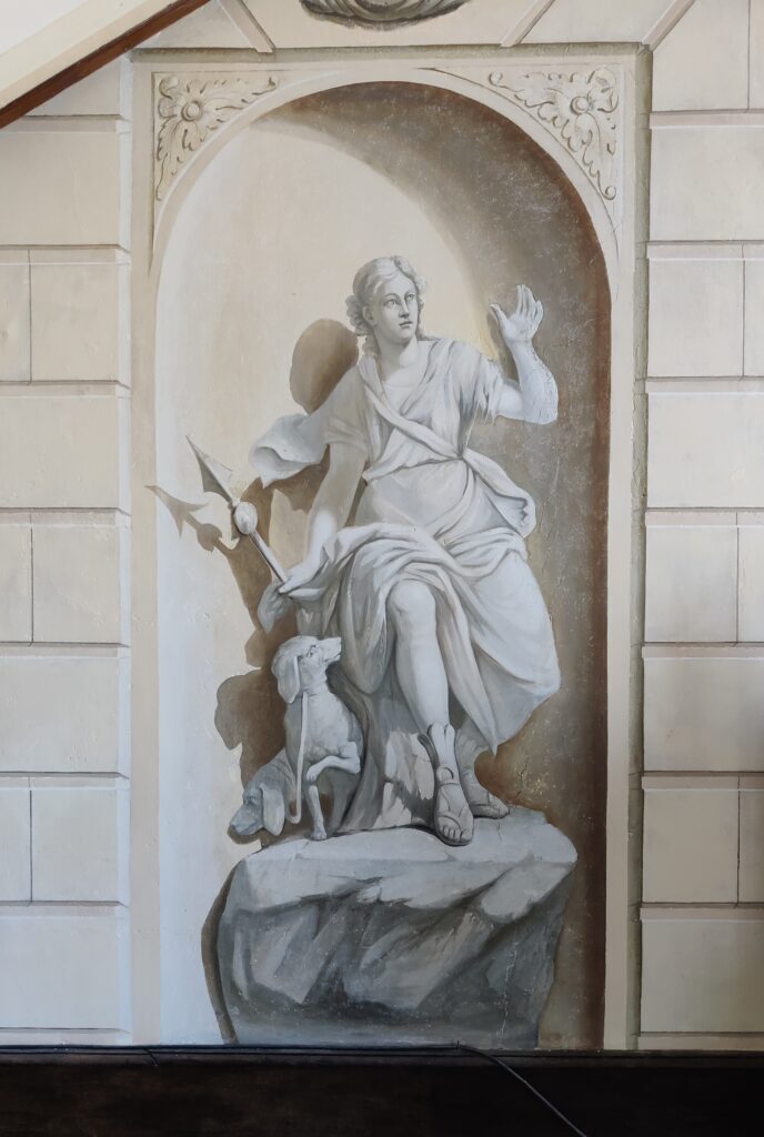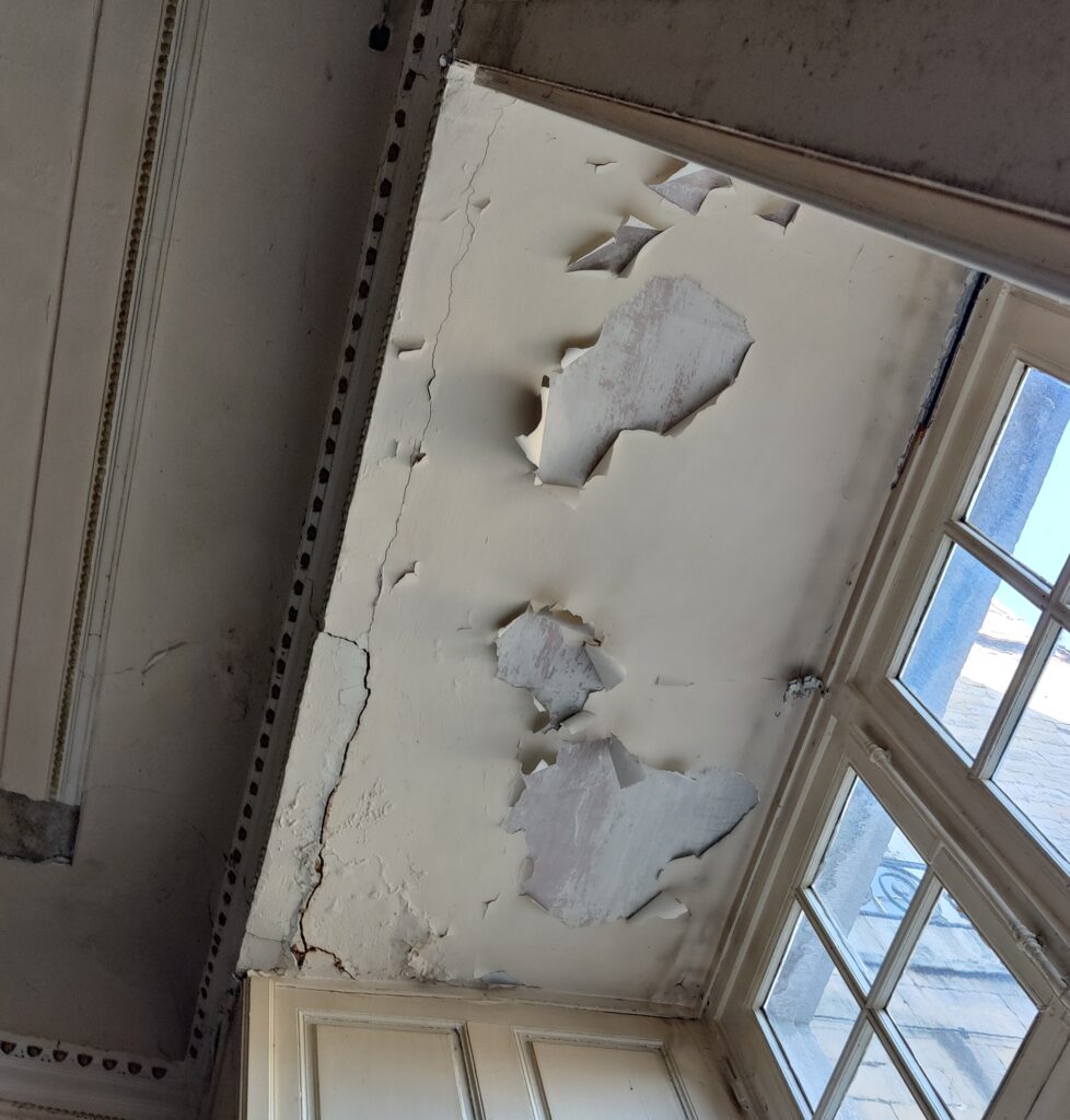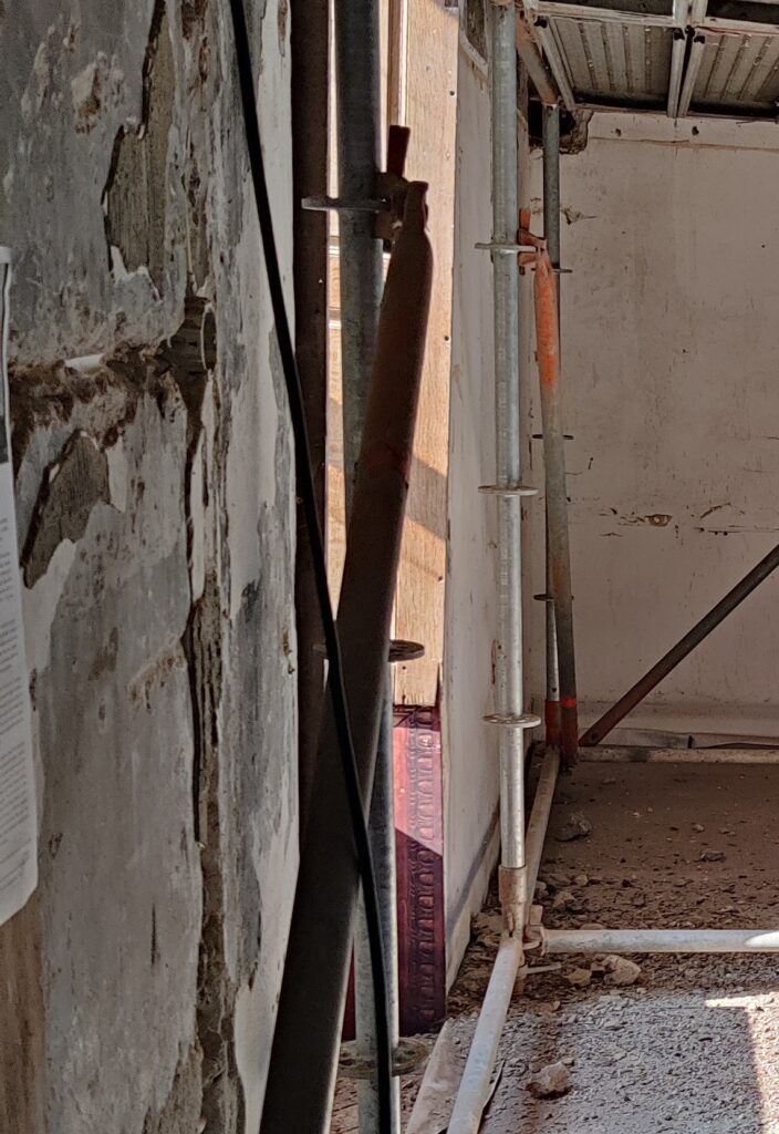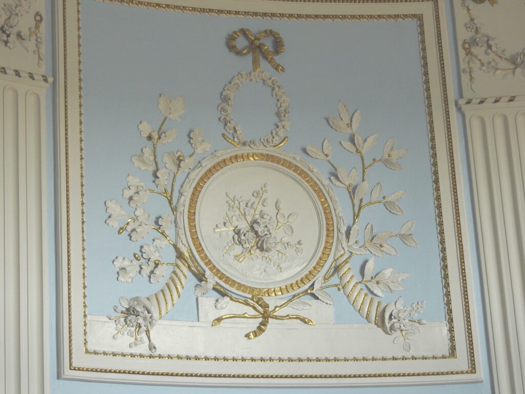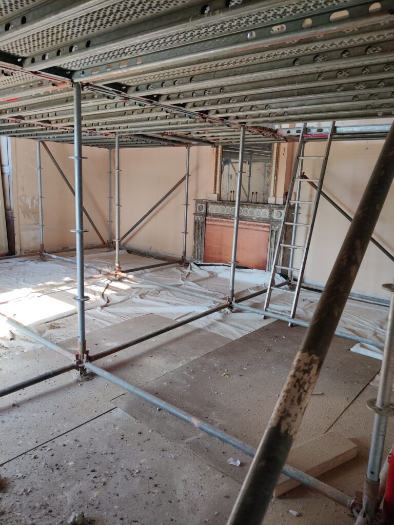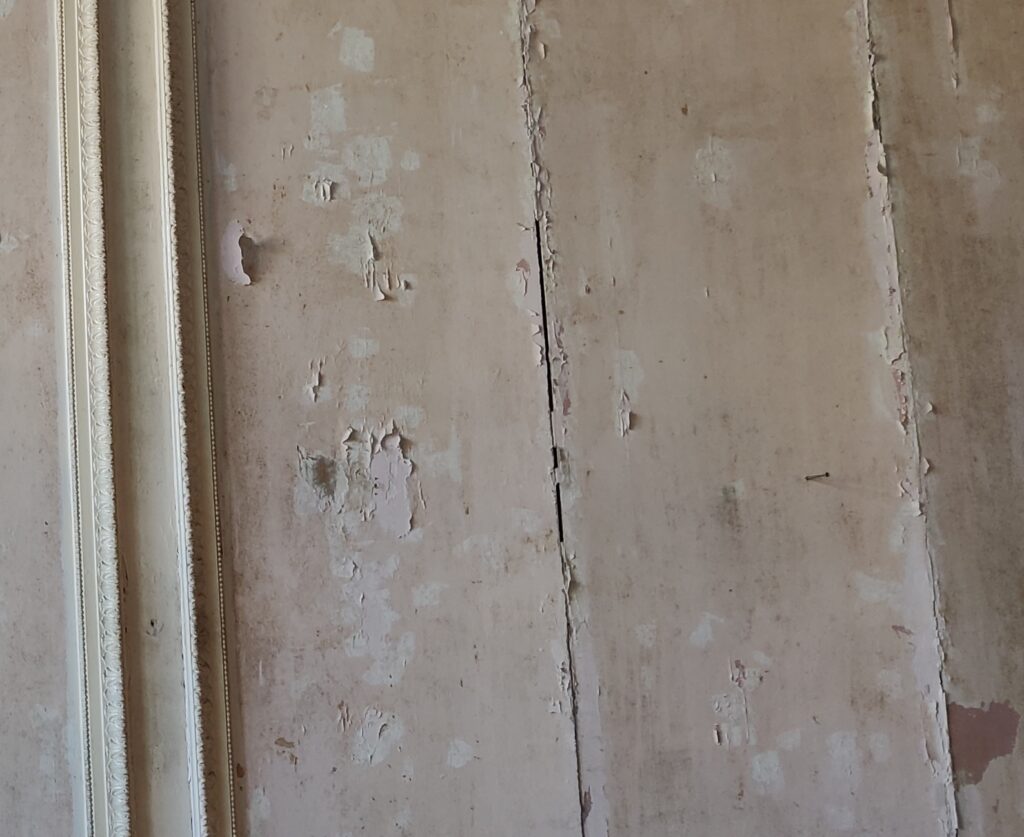 Onderstaande foto’s geven een impressie van de zwaar verwaarloosde toestand van de ruimtes in het kasteel en het vele werk dat inmiddels door de vrijwilligers gedaan is. Achter het stuc- en verfwerk bevonden zich wanddecoraties die inmiddels gedeeltelijk gerestaureerd zijn.