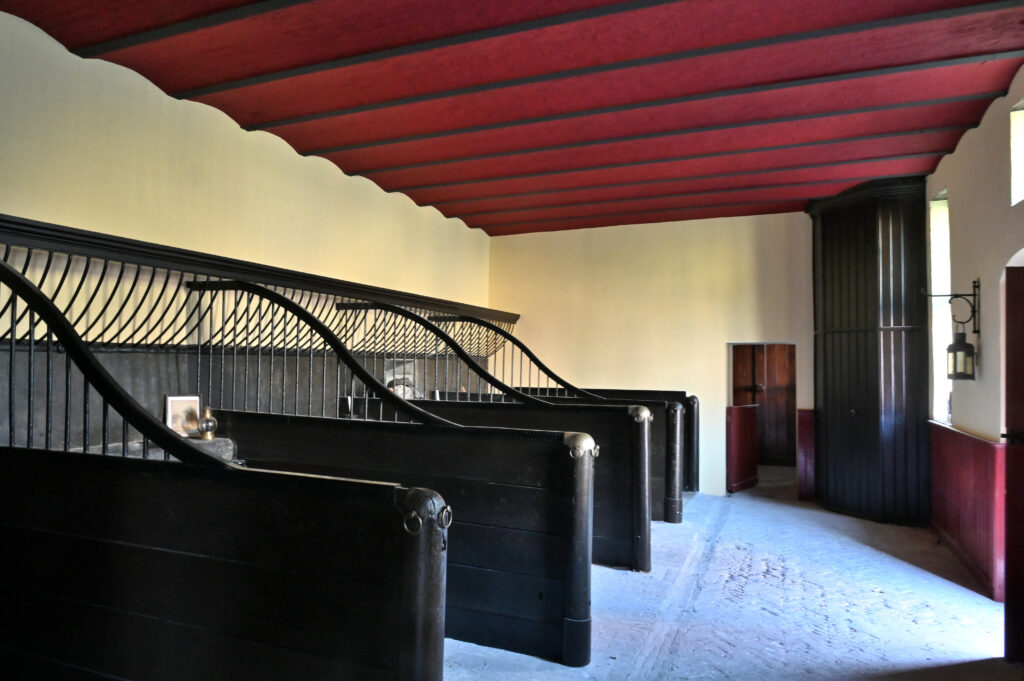 Het interieur van de varkensstallen verraste ons door de fraaie vormgeving.